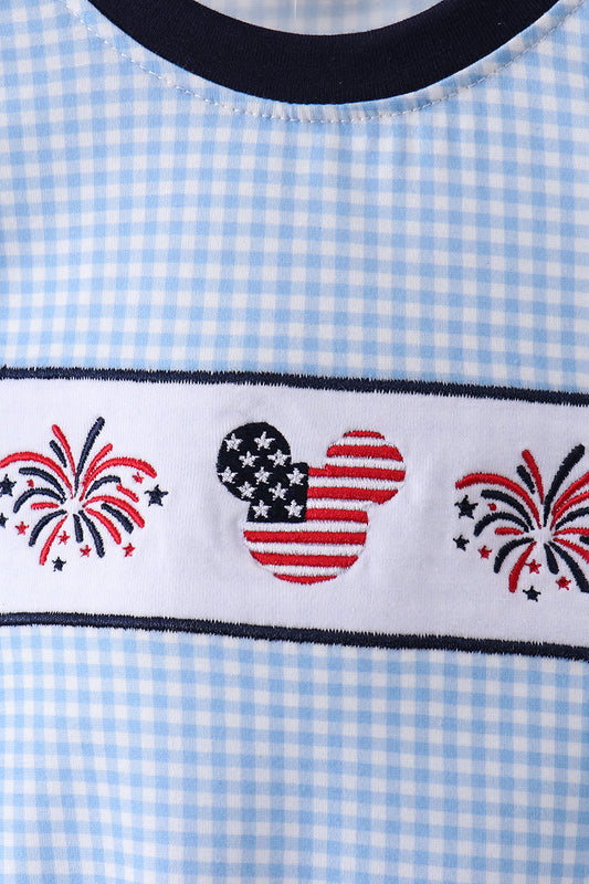 Blue character fireworks embroidery gingham ruffle shorts set